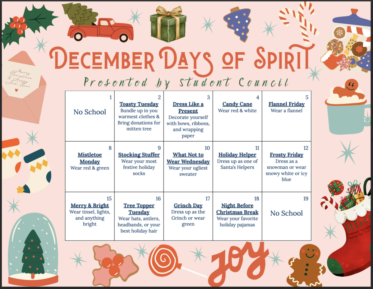Student Council Spotlight Student council is sponsoring our mitten tree please see flyer attached! Attached Files Mitten Tree Flyer.pdf December Days of Spirit.pdf
